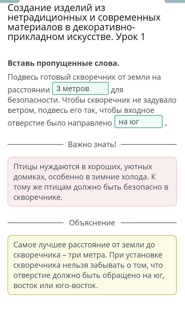 для безопасности. Чтобы скворечник не задувало ветром, подвесь его так, чтобы входное отверстие было направлено ( на север, на юг, на запад. )