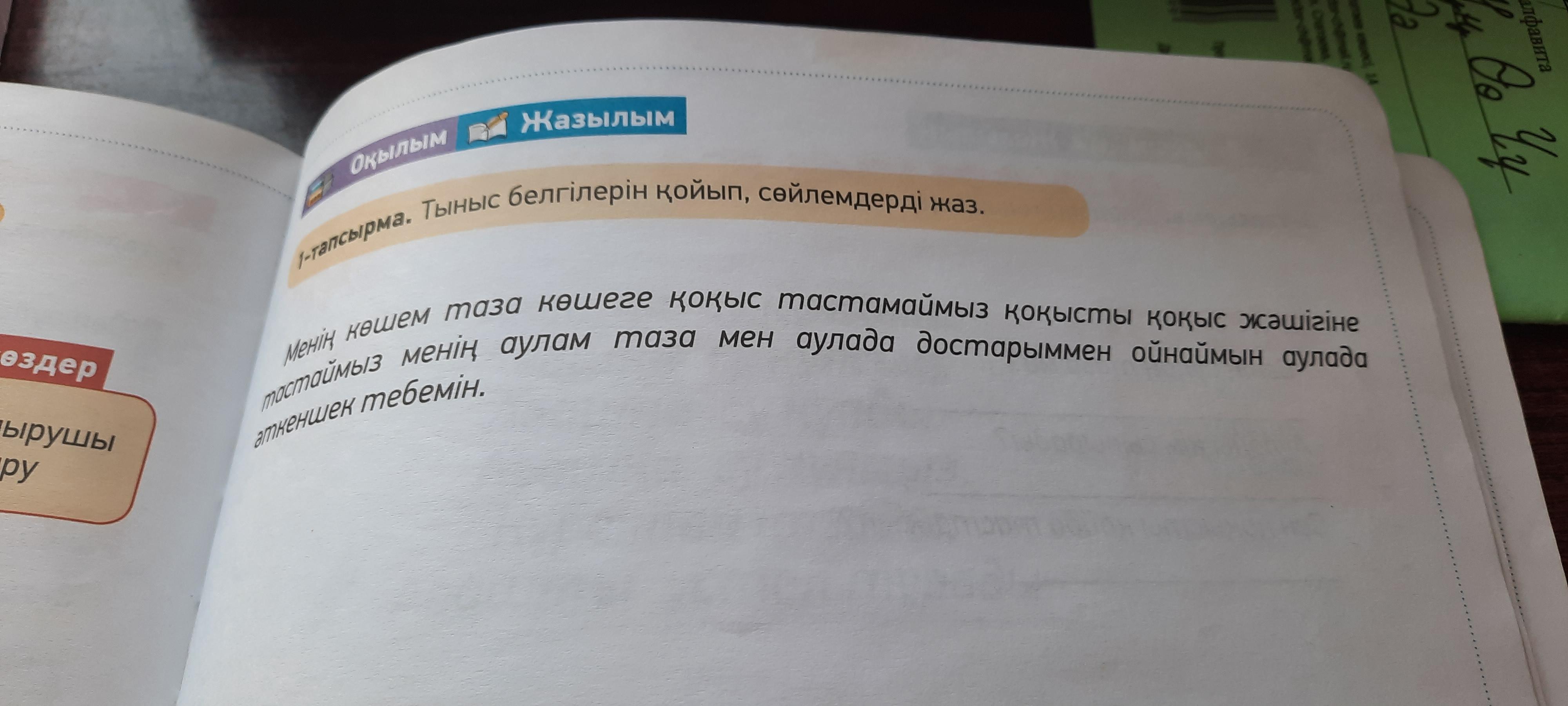 Менің көшем таза, көшеге қоқыс тастаймыз, қоқыс жәшігіне тастаймыз, менің аулам таза, мен аулада достарымен ойнаймын, аулада әткеншек тебемін.
