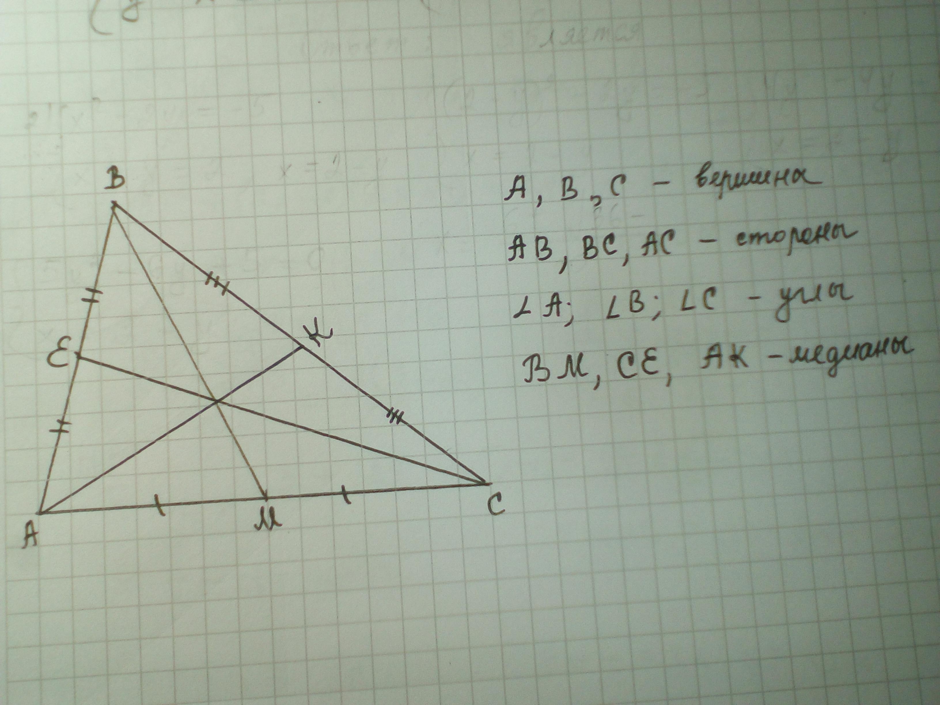 Начертите произвольный треугольник, укажите его соответственные элементы (вершины, стороны, углы) (названия). Проведите медианы из каждого угла.