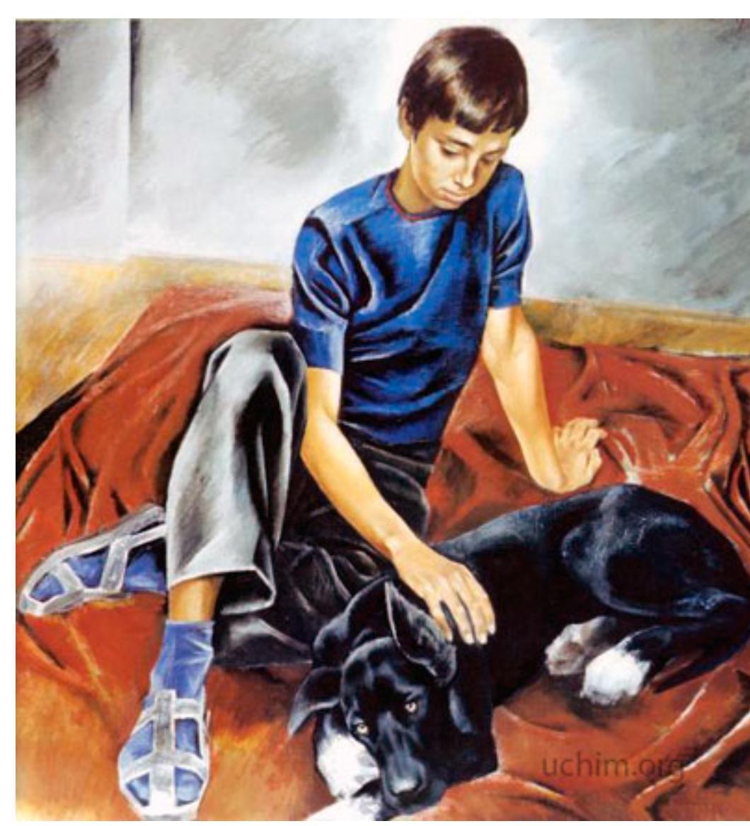 На произведении изображен сидящий юный мальчик, рука которого ласково лежит на его черного цвета собаке, с ярко выделяющимися глазами. Цветовая гамма, подобранная художником впечатляет: серые стены, будто опоры хладного спокойствия, пламенно-красная ткань, объединившая двух персонажей, показывая их целостность.