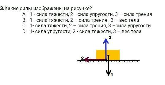 А. 1 сила тяжести ., 2 на сила упругаити 3, сила трения