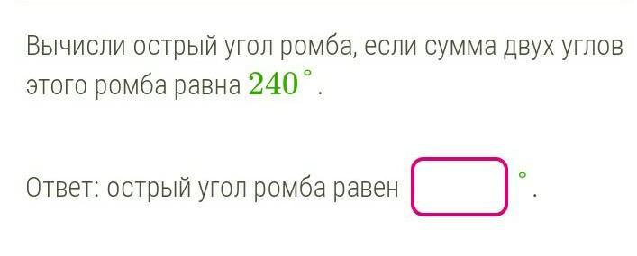 противоположные углы равны ⇒ 240/2=120° - тупые углы ромба, (180-120)=60° - острые углы ромба.