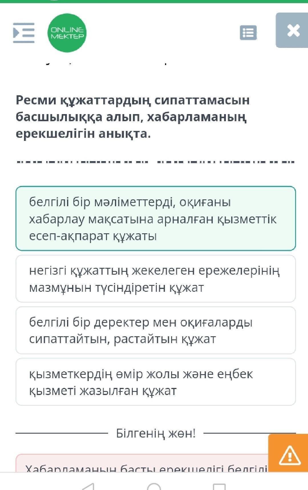 белгілі бір мәліметтерді, оқиғаны хабарлау мақсатына арналған қызметтік есеп-ақпарат құжа