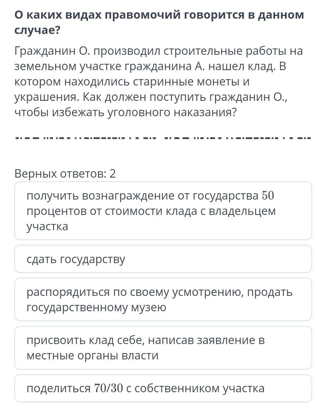 Неправильно! Ответ:получить вознаграждение от государства 50% от стоимости клада с владельцем участка.