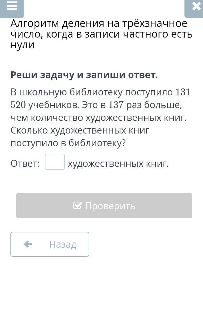 В школьную библиотеку поступило 131 520 учебников. Это в 137 раз больше, чем количество художественных книг. Сколько художественных книг поступило в библиотеку?