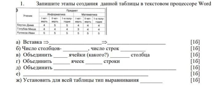 Запишите этапы создания данной таблицы в текстовом процессоре Word а) Вставка _____________ б) Число столбцов- _________, число строк _________в) Объединить _____ ячейки (какого?) _______ столбца г) Объединить ______ ячеек ____ стоки д) Объединить____ е) _ ж) Установить для всей таблицы тип выравнивания