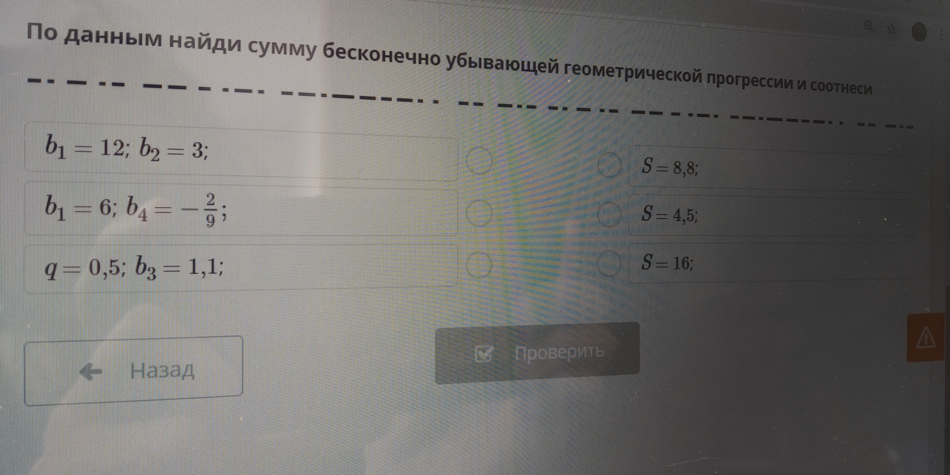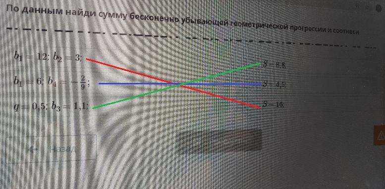 По данным найди сумму бесконечно убывающей геометрической прогрессии и соотнести