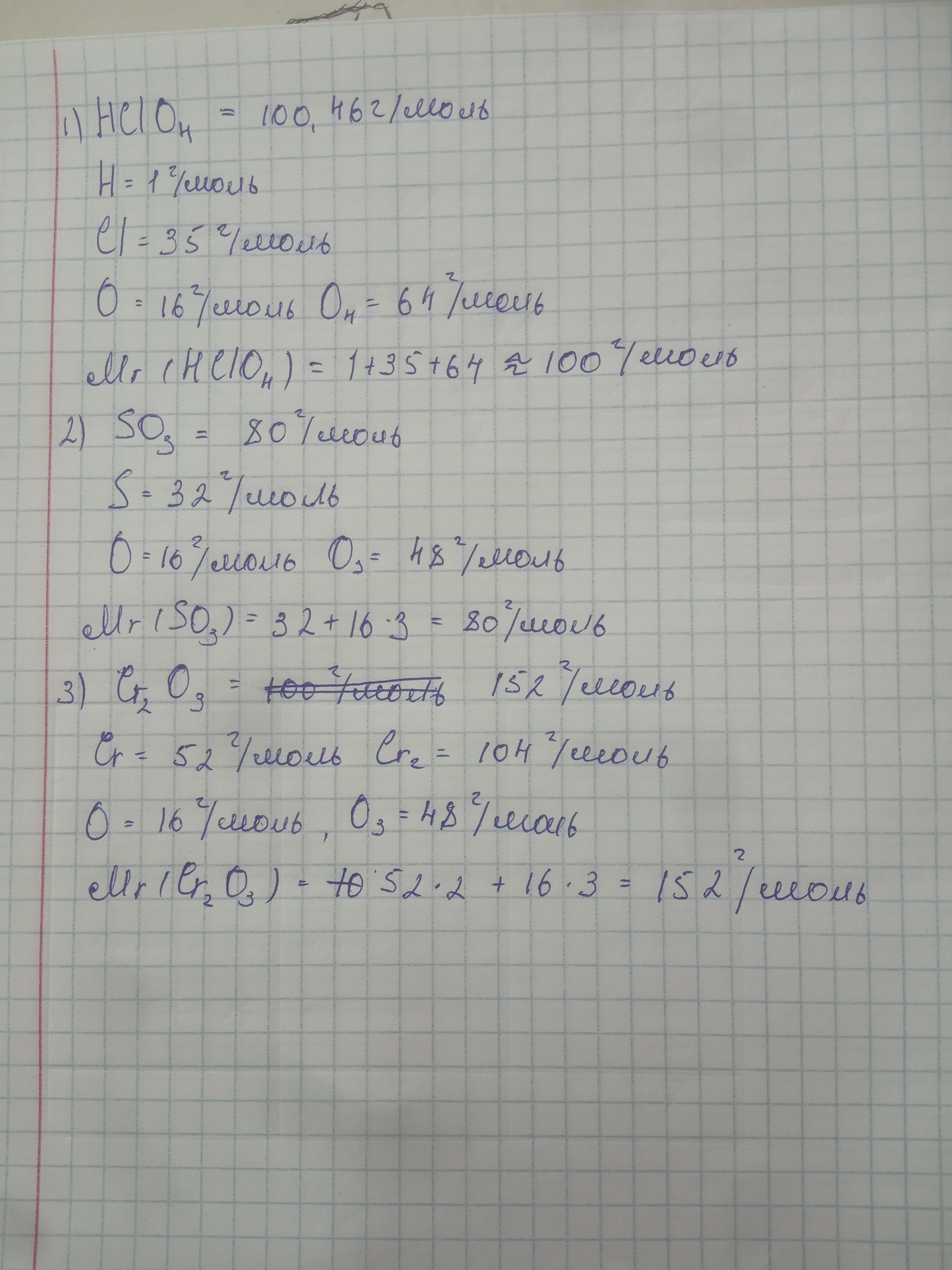 вычислите относительные молекулярные массы mr в следующих соединениях: HCIO4,SO3,Cr2O3