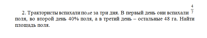 Пусть площадь поля - х. Тогда 1 день - 4/7х, 2 день -0,4х, 3 день -48 га. составим и решим уравнение