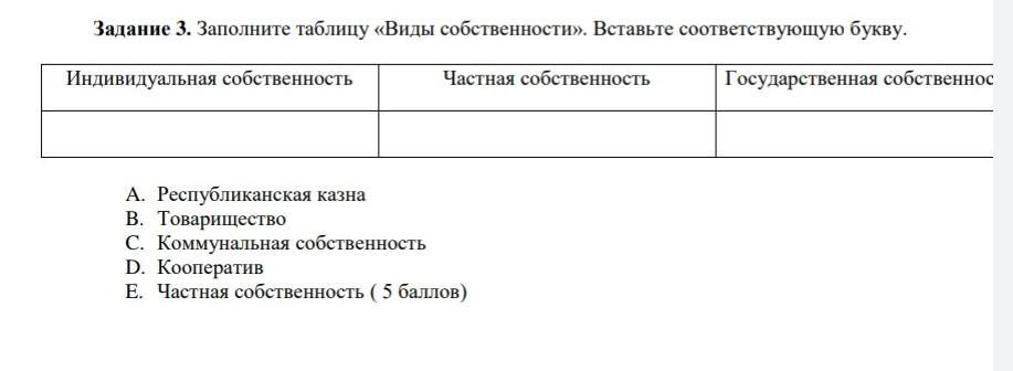 Заполните таблицу «Виды собственности». Вставьте соответствующую букву. Индивидуальная собственность Частная собственность Государственная собственнось