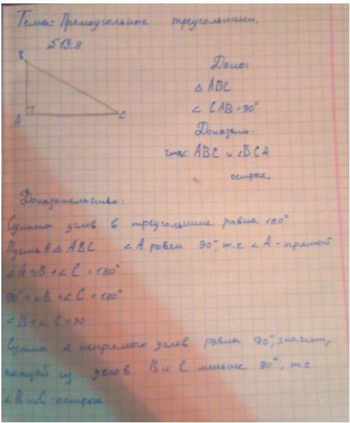 Сумма углов в треугольнике равна 180°; В прямоугольном треугольнике один угол равен 90°, значит сумма двух других не должна превышать 90°. Соответственно каждый угол меньше 90°, а угол меньше 90°, только острый.