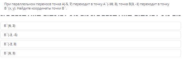 При параллельном переносе точка А(-5, 7) переходит в точку А`(-10, 3), точка В(3, -1) переходит в точку В`(х, у). Найдите координаты точки В