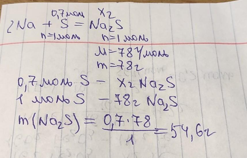 Рассчитайте массу сульфида натрия Na2S, образовавшейся из серы количеством вещества 0,7 моль. 2Na+S=Na2S