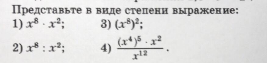 Объяснение: 1) x⁸·x²=x¹⁰; 2)x⁸:x²=x⁶; 3)(x⁸)² =x¹⁶; 4) = x²⁰· x²:x¹²= x²⁰⁺²⁻¹²= x¹⁰.