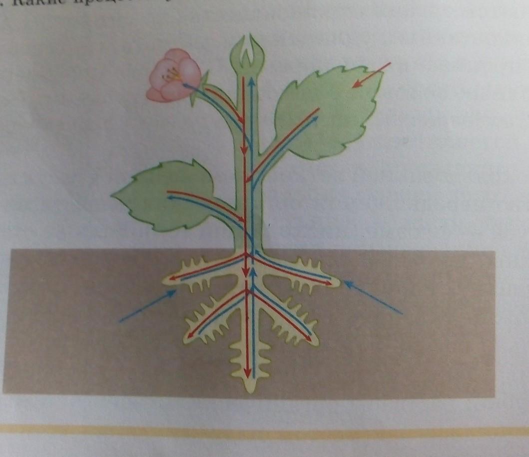 3 Транспорт веществ в растении осуществляется в виде восходящего и нисходящего токов. Синей стрелкой обозначен восходящий поток, красной-нисходящий. Какие процессы указаны на рисунке?