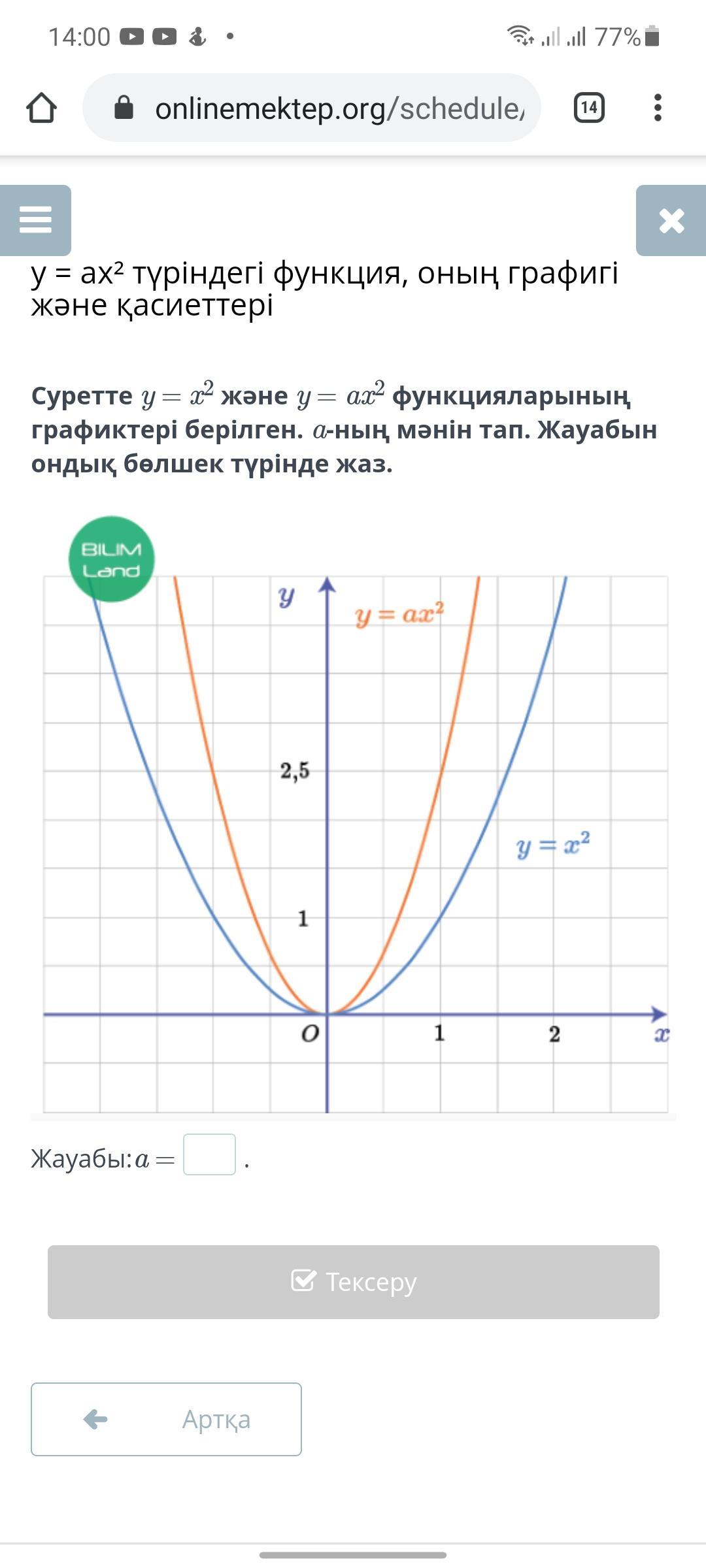 Найдите значение a = на рисунке, который представляет собой график функций y = x ^ 2 и y = ax ^ 2. Запишите ответ в десятичной форме.