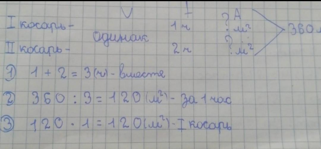 Какое условие задачи: Двое косарей вместе скосили траву с 360м2. Один из них работал 1час, другой-2часа. С какой площади скосил каждый, если спросить работы (производительность) у них одинаковая?