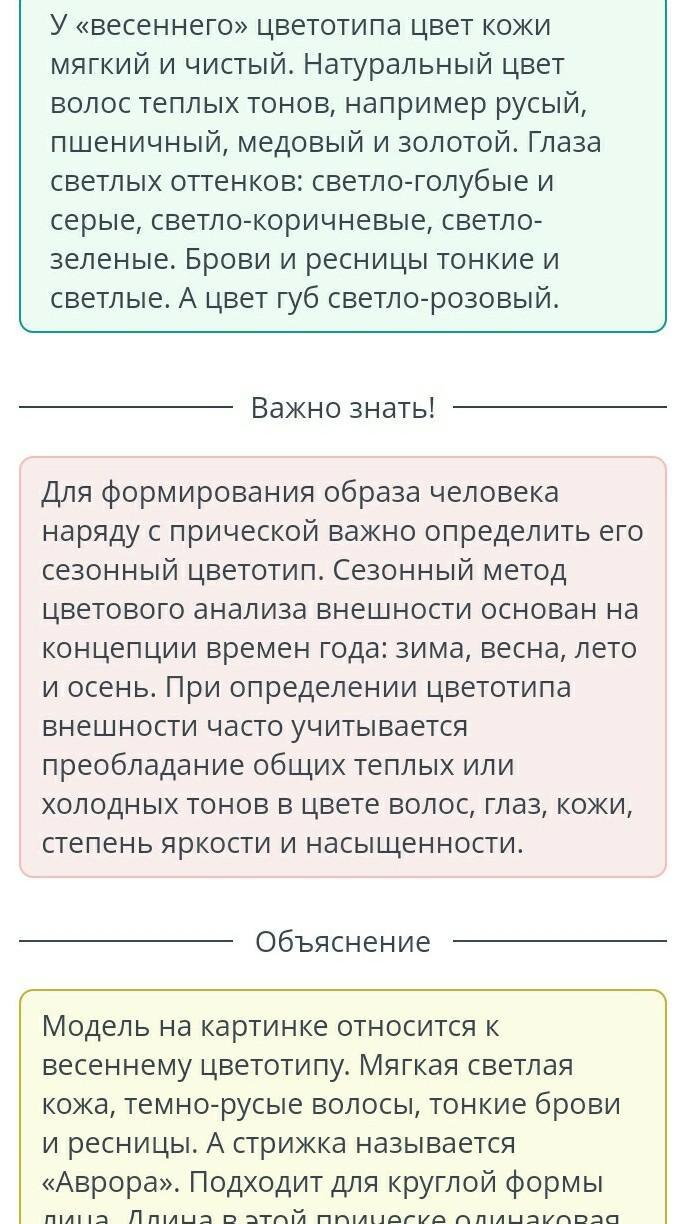 определи, какая прическа изображена на фотографии, и подбери подходящий цветотип.  верных ответов: 2 у «весеннего» цветотипа цвет кожи мягкий и чистый. натуральный цвет волос теплых тонов, например русый, пшеничный, медовый и золотой. глаза светлых оттенков: светло-голубые и серые, светло-коричневые, светло-зеленые. брови и ресницы тонкие и светлые. а цвет губ светло-розовый. для летнего цветотипа характерны естественные цвета кожи (светло-розовый, пшеничный, бронзовый). глаза серые, серо-голубые, серо-зеленые, темно-коричневые, коричневые. губы бледно-розовые. к этому цветотипу больше подходят холодные оттенки. «аврора» – волосы стригутся ровно по длине, выполняется только прореживание кончиков. «каскад» – это стрижка разной длины. самая короткая часть стрижки находится на затылке и удлиняется к лицу. знания.ком