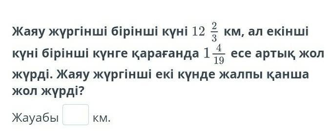 12 2/3 × 14/19 = 38/3 × 14/19 = 28/3 = 9 2/3км - екінші күні