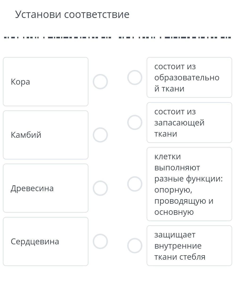 Установи соответствие состоит из образовательно й ткани состоит из запасающей ткани клетки Выполняют разные функции: опорную, проводящую и основную защищает внутренние ткани стебля Кора Камбий О Древесина Сердцевина