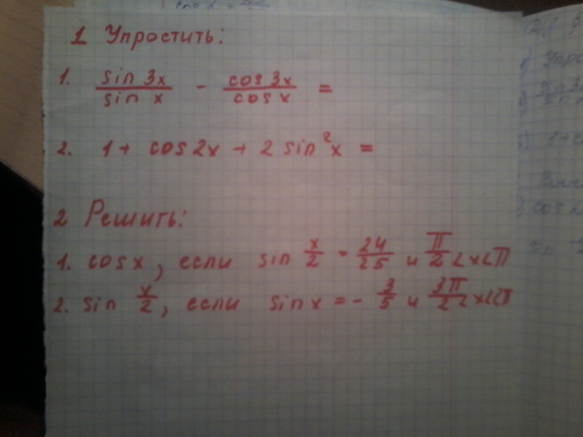1) sin(3x)/sinx - cos(3x)/cosx = (cosx*sin(3x) - sinx*cos(3x)) / (cosx*sinx) = 2, т.к.: