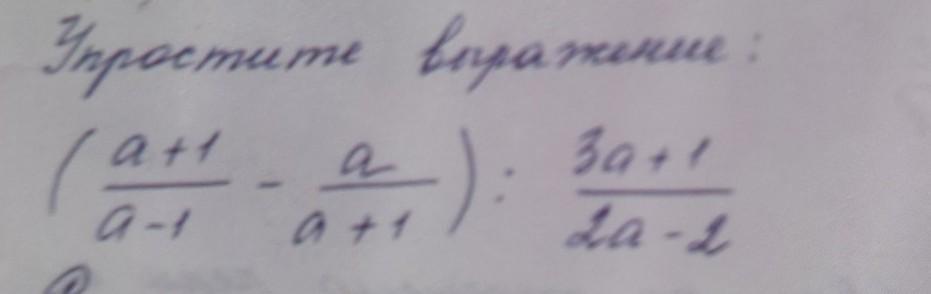 сначала в скобках приводишь к общему знаменателю: первое умножаешь на а+1, второе на а-1, далее делишь полученное. не забудь то, что при делении дроби переворачиваются