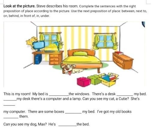 1. between 2. next to 3. on 4. behind 5. in front of 6. in 7. under