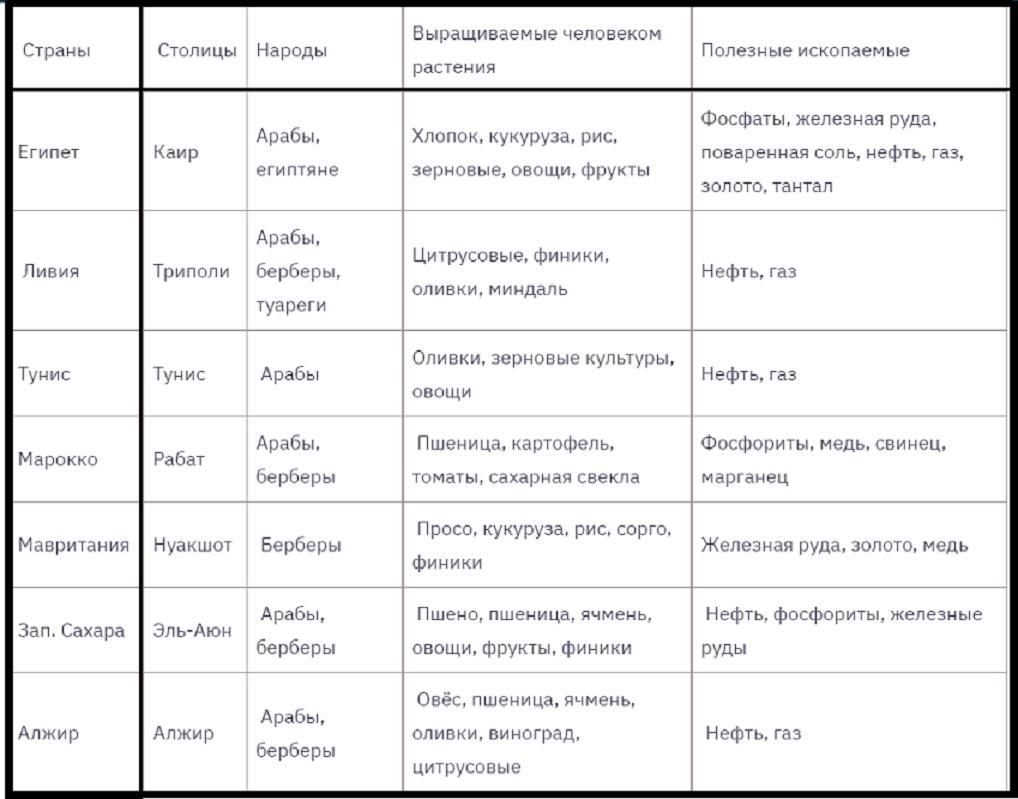 заполните таблицу «Страны Северной Африки. Страны Африки: Египет, Ливия, Тунис, Марокко, Мавритания, Западная Сахара, Алжир ,Столианы Северца. Народы. Выращиваемые человеком растения. Добываемые полезные ископаемые