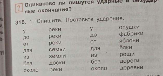 у рекИ, у опУшки, до рекИ, до фАбрики, от рекИ, от Яблони, для семьИ, для Ёлки, из землИ, из рОщи, без доскИ, без дорОги, около рекИ, около дерЕвни.