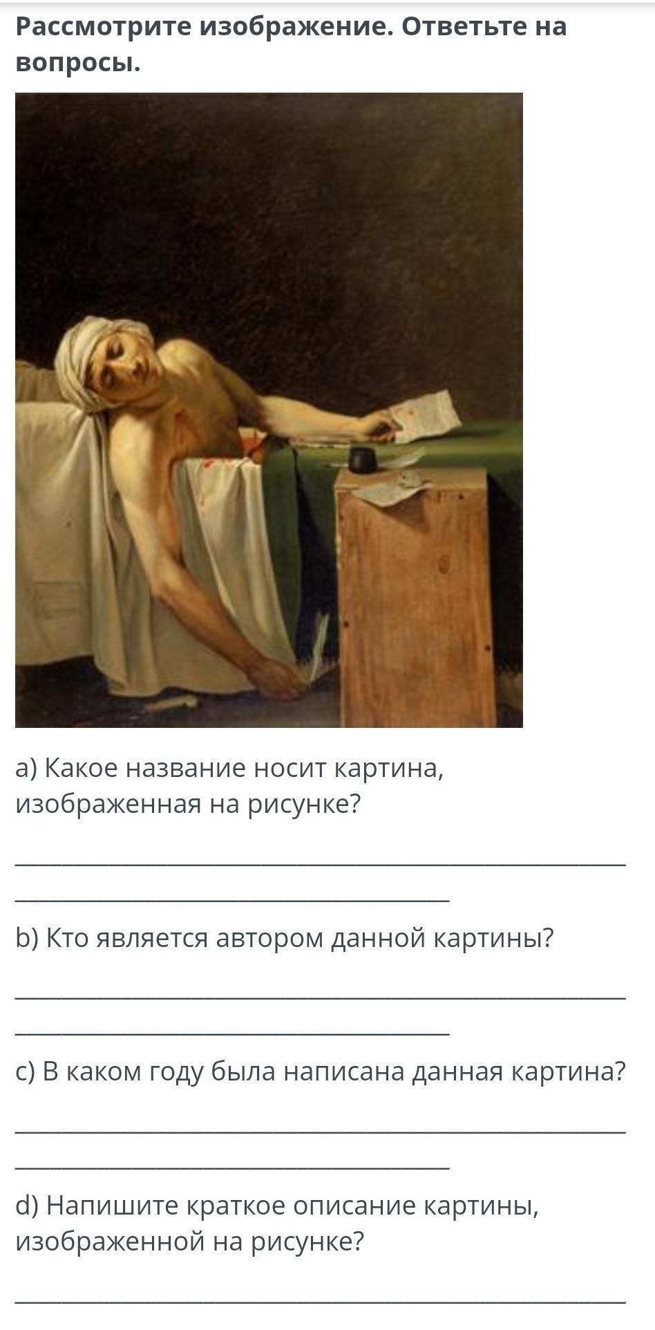 ЖАН ПОЛЬ МАРАТ БЫЛ УБИТ ДВОРЯНКОЙ ШАРЛОТТОЙ КОРДЕ,ДАВИТ СИМПОТИЗИРОВАЛ РЕВОЛЮЦИИ И ЕГО ВЕЛИЧЕСТВЕННЫЕ ИСТОРИЧЕСКИЕ КАРТИНЫ РАССМАТРИВАЛИСЬ КАК ПРИЗЫВ К ПОЛИТИЧЕСКИМ ДЕЙСТВИЯМ .