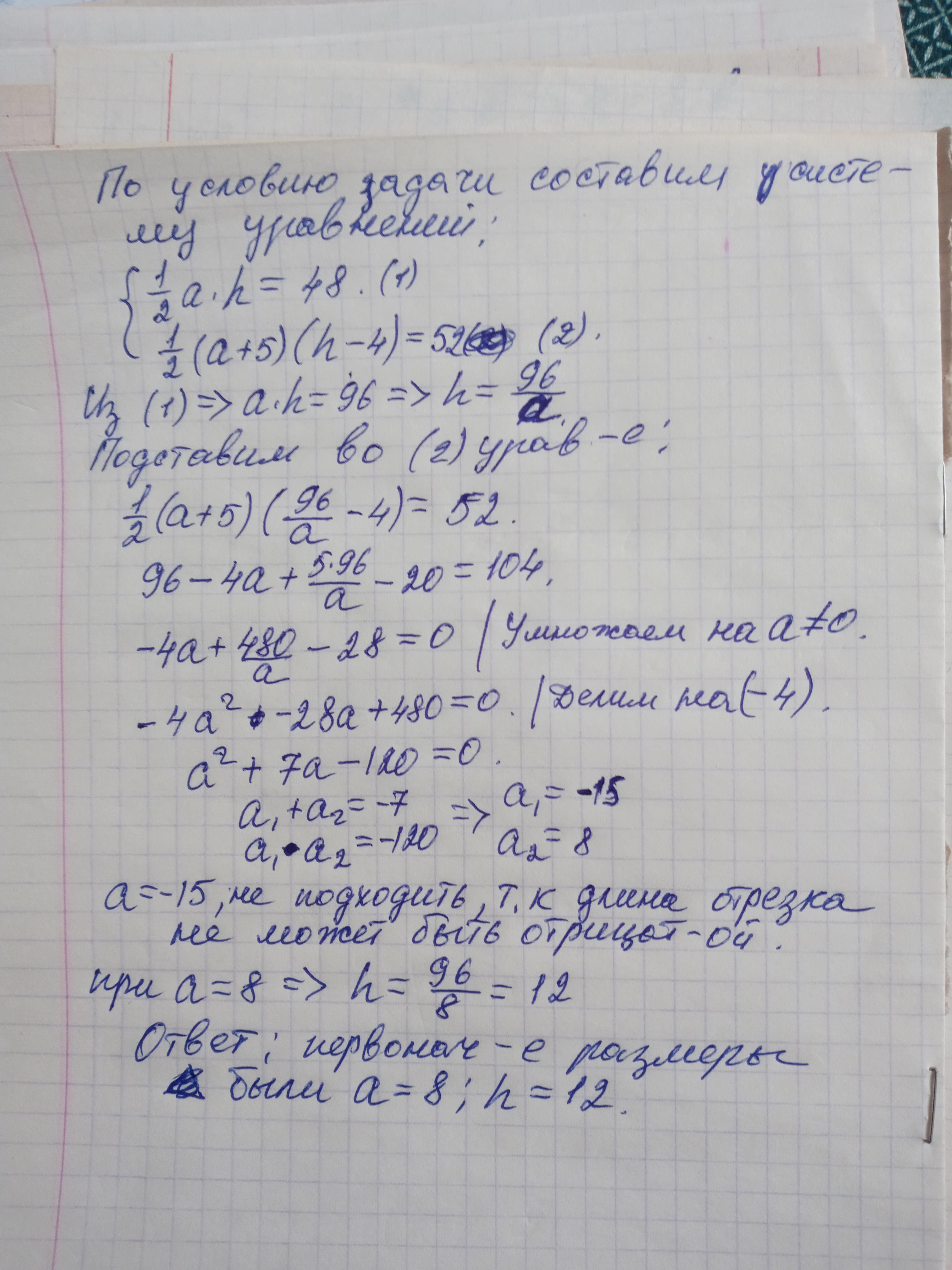 высоту уменьшить на 4 дм, то площадь увеличиться на 4 дм 2 . Найти