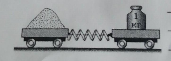 нити пружина распрямляется, расталкивая а в противоположные стороны, в результате чего они приобретают одинаковые скорости. Чему равна масса песка на левой тележке? Ответ поясните.