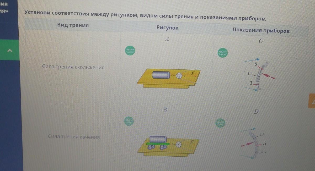 Установи соответствия между рисунком, видом силы трения и показаниями приборов.