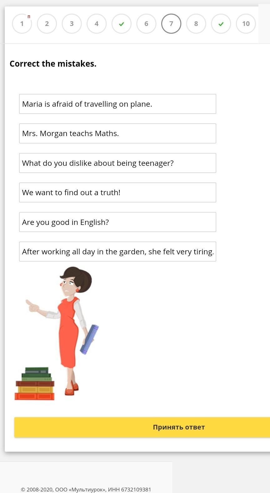 Ответ:1. On - in 2. Teaches math 3. Being a teenager 4. The truth! 5 Do you speak good in English? 6. She felt very tired