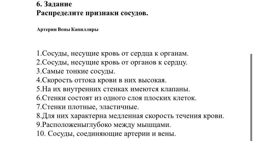 Капилляры: 3)Самые тонкие сосуды; 6)Стенки состоят из одного слоя плоских клеток; 8)Для них характерна медленная скорость течения крови; 10)Сосуды, соединяющие артерии и вены.
