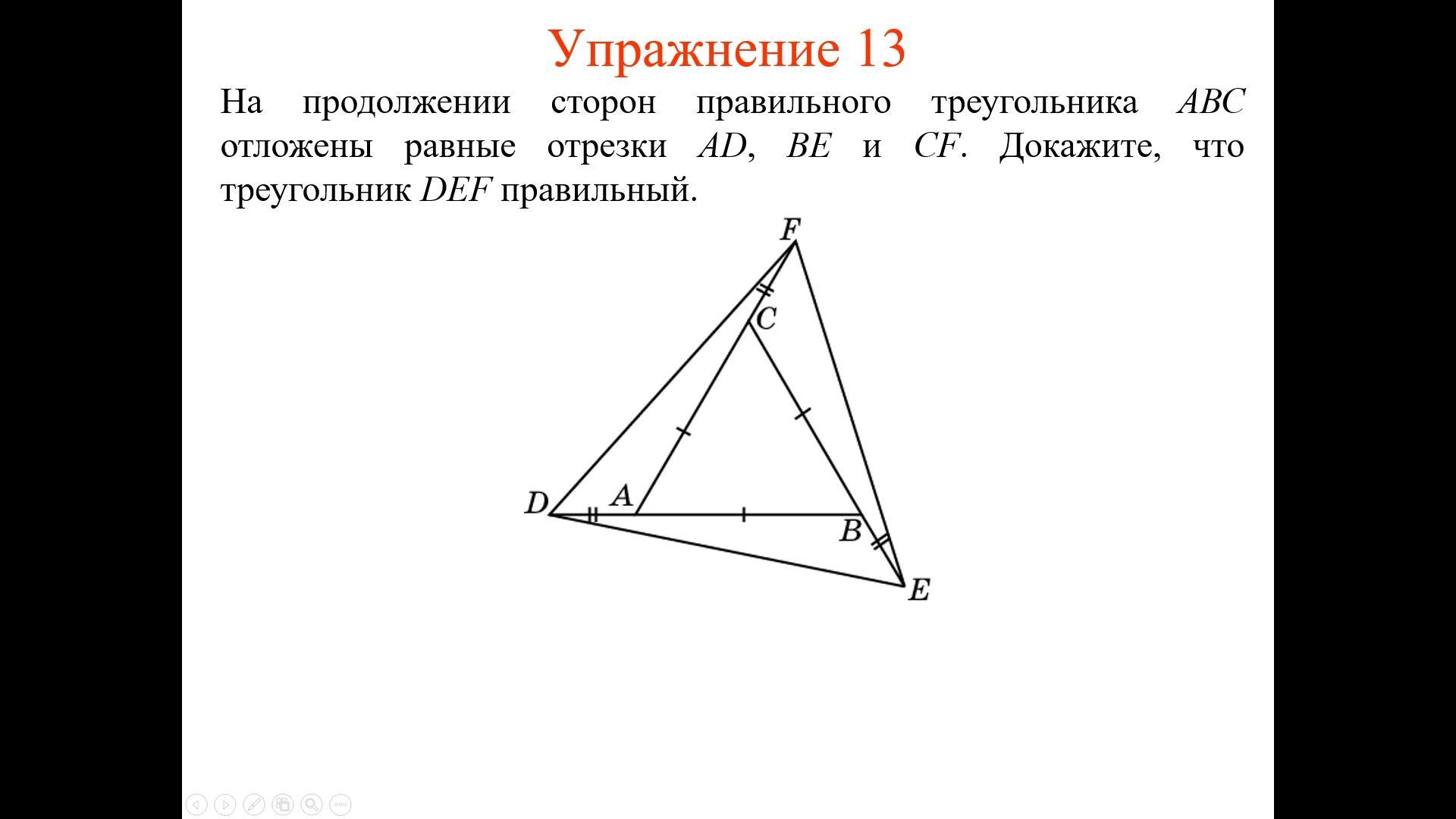 стороны, которые 2 полосками подчёркнуты равны, представь треугольник DAF он равнобедренный, также с двумя остальными треугольниками.