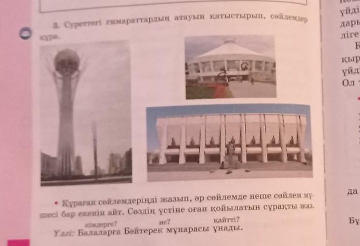 Суреттегі ғимаратиардың атауын қатыстырып, сөйлемдер құра.