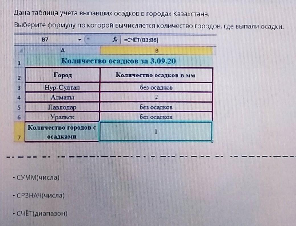 Формула СЧЁТ (диапазон) возвращает количество ячеек, содержащих числа (в нашем случае, количество городов с осадками).