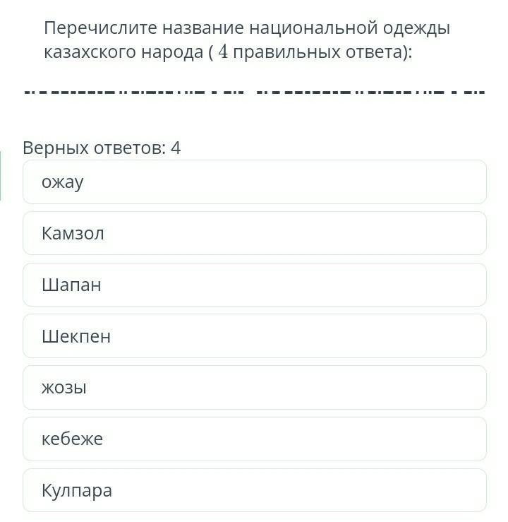 перечислите название национальной одежды казахского народа (4правильных ответа)