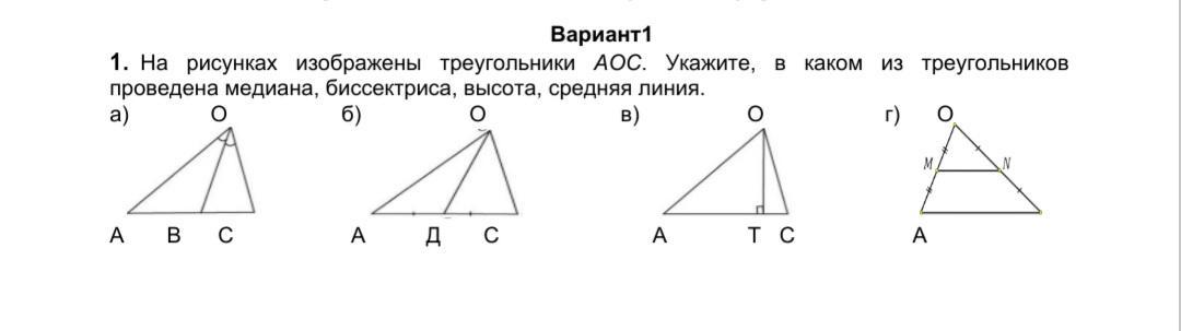 1. На рисунках изображены треугольники АОС. Укажите, в каком из треугольников проведена медиана, биссектриса, высота, средняя линия.