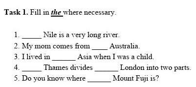 1 THE Nile is a very long river. 2. My mom comes from --- Australia. 3. I lived in --- Asia when I was a child. 4. THE Thames divides --- London into two parts. 5. Do you know where --- Mount Fuji is?