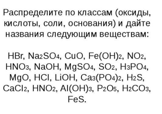 Кислоты: HBr(бромоводородная), HNO3(азотная), H3PO4(фосфорная), HCl(соляная или хлороводород), H2S(сероводород), HNO2(азотистая), H2CO3 (угольная)