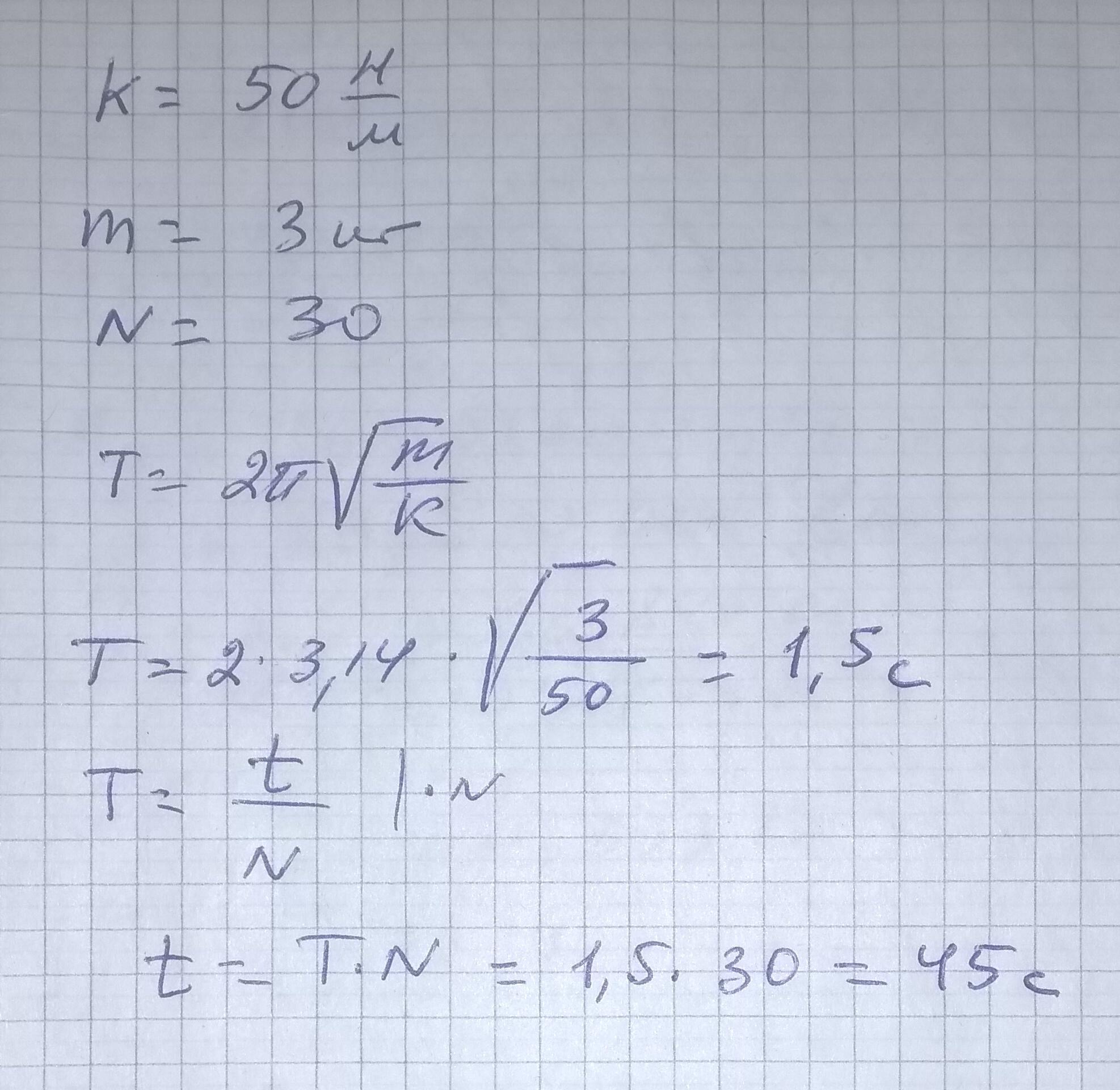 На пружину жесткостью 50 Н/м подвешивают груз массой 3кг. за какое время груз совершит 30 полных колебаний?