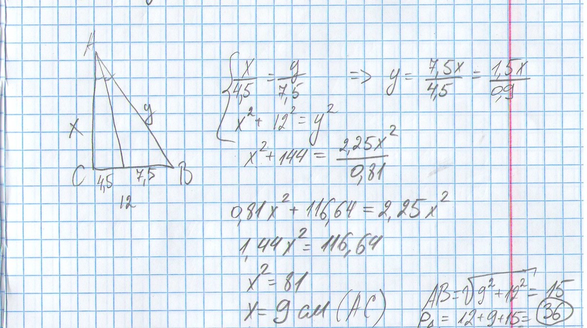 Биссектриса острого угла прямоугольного треугольника делит противоположный катет на отрезки 4,5 см и 7,5 см. Найти периметр треугольника.