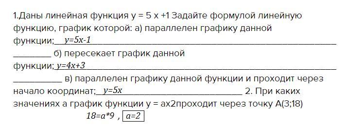 1.Даны линейная функция y = 5 x +1 Задайте формулой линейную функцию, график которой: а) параллелен графику данной функции;___________________________________________________________ б) пересекает график данной функции;_____________________________________________________________ в) параллелен графику данной функции и проходит через начало координат;___________________________ 2. При каких значениях а график функции у = ах2проходит через точку А(3;18)