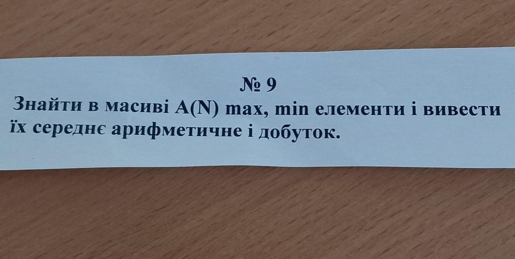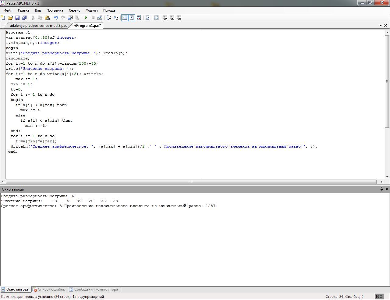 WriteLn('Среднее арифметическое: ', (a[max] + a[min])/2 ,' ' ,'Произведение максимального элемента на минимальный равно:', t);