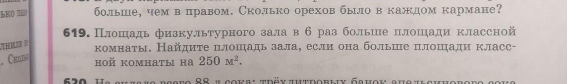 Пусть Х кв.м - площадь классной комнаты, тогда площадь зала 6Х или Х+250 (кв.м). Составим и решим уравнение: