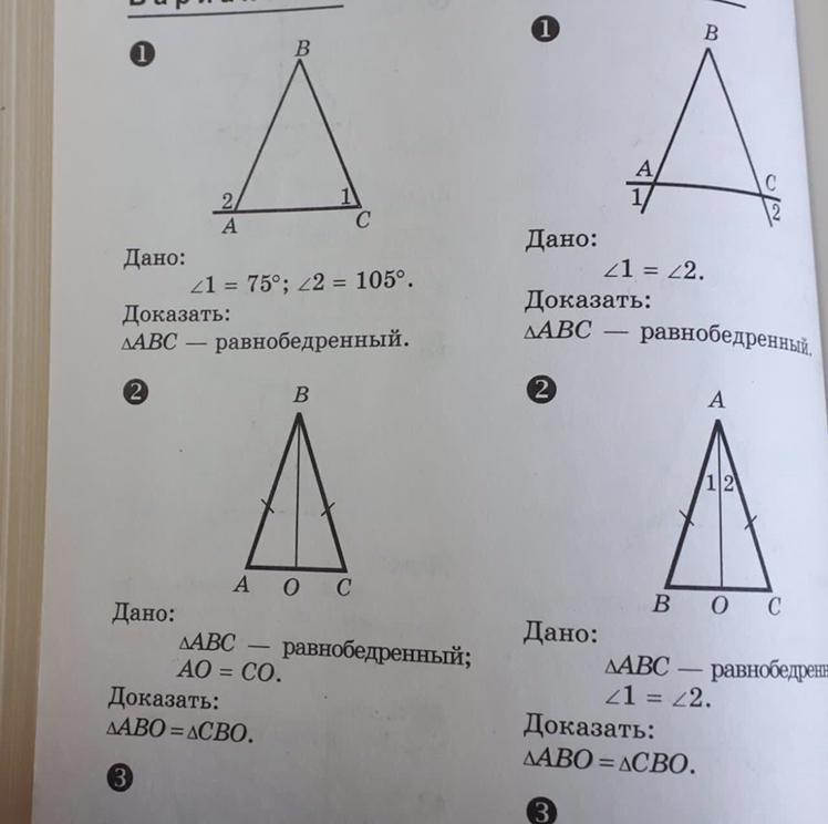 1. угол смежный с углом 2 - (180-105)=75°, ∡А=∡С=75° ⇒ ΔАВС равнобедренный;
