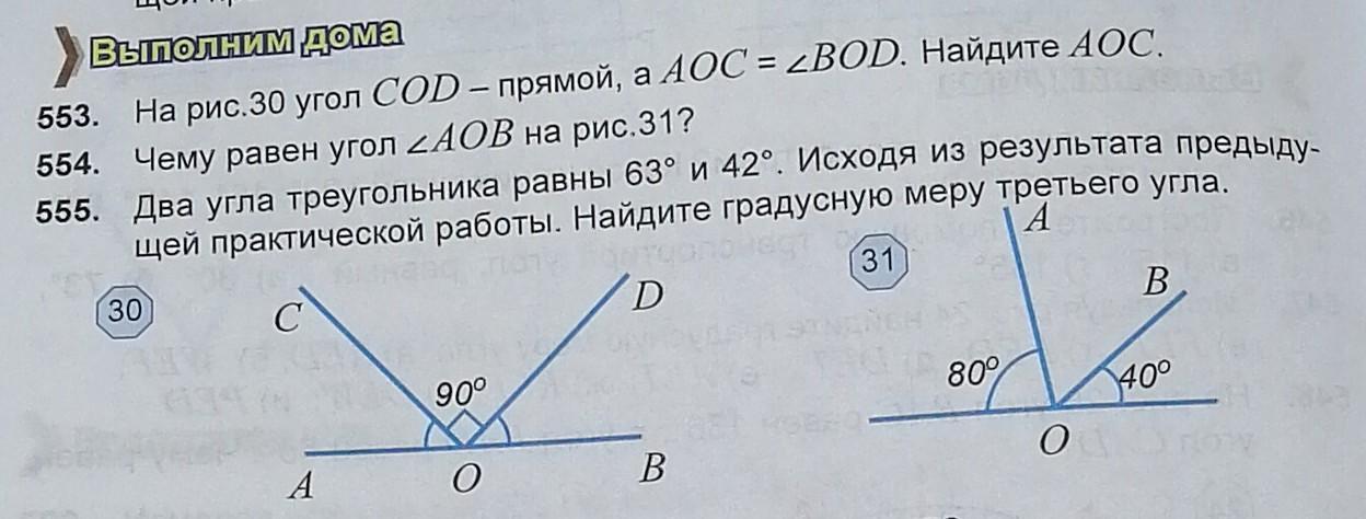 5 класс школа246 по математике задание 553 на рис 30 угол COD-прямой, а AOC=BOD. Найдите AOC