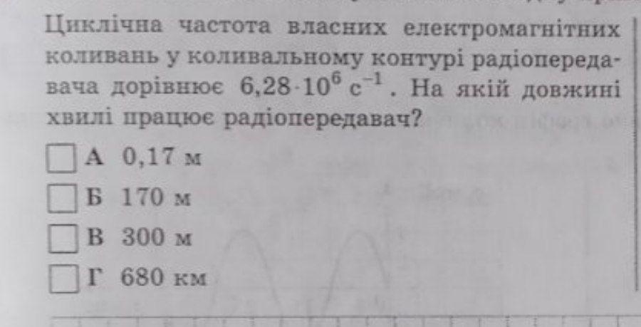 Циклічна частота власних електромагнітних коливань у коливальному контурі радіопередавача дорівнює 6,28×10^{6} сек^{-1} . На якій довжині хвилі працює радіопередавач?